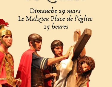 Comme annoncé lors de la galette des rois, et dans la suite de la crèche vivante, nous vivrons la Passion du Christ en grandeur nature dans les rues du Malzieu, le dimanche des Rameaux le 13 avril à 15h. Pour mener à bien ce projet, nous avons besoin de nombreuses bonnes volontés. Nous recherchons des acteurs, des figurants, des personnes qui s'occupent des costumes, d'autres, de la musique et de la logistique, puisque nous nous déplacerons dans les rues du Malzieu.