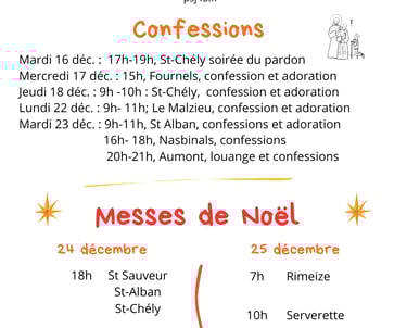 Un grand MERCI à tous ceux qui ont réalisé de magnifiques crèches dans nos églises, MERCI à ceux qui tiennent ouvert ces lieux de prière. Lors de votre visite, vous trouverez un panier près des crèches pour déposer vos intentions de prière. Voici la liste des crèches qui nous ont été signalées : Aumont-Aubrac, Brion, Fournels, Javols, Le Bacon, Le Malzieu, Nasbinals, Rimeize, Saint-Alban, Saint-Chély d’Apcher, Ste Colombe, Le Fau de Peyre, St Sauveur, Serverette, Rimeize, Chaulhac, Prunières, Sainte Eulalie, les Estrets, Les Bessons, St-Léger du Malzieu, Berc, La Chaze de Peyre.