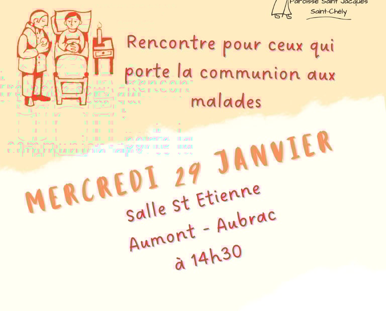 Toutes les personnes qui apportent la communion aux malades à domicile, ou qui souhaitent rendre ce service, sont invitées à une rencontre organisée par la Paroisse le mercredi 29 janvier de 14h30 à 16h à la salle Saint-Étienne d’Aumont. Cette rencontre a pour but d’encourager ce service, et aussi de donner quelques conseils pratiques. Nous finirons par le partage du goûter.