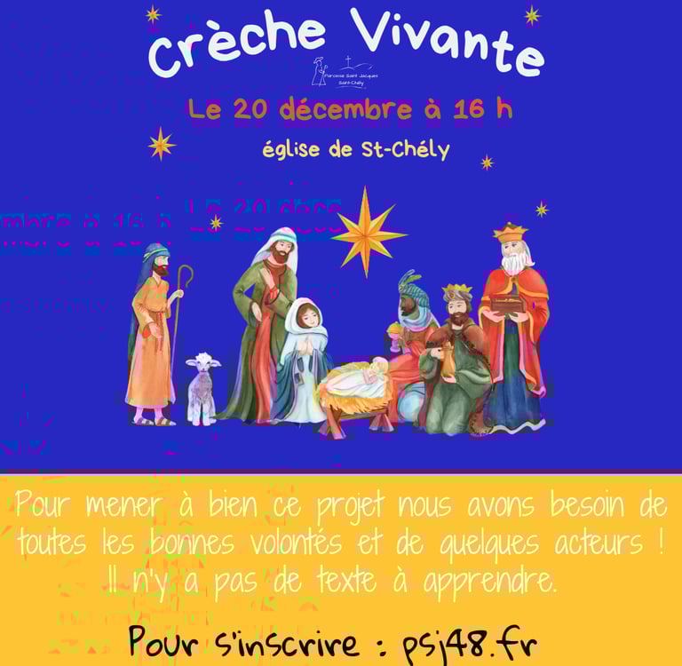 Nous voulons mettre en scène l’Evangile, de l’Annonciation à la Nativité. La première rencontre de préparation est prévue le 3 decembre à 18h30 au 45 rue Théophile Roussel à St-Chely.